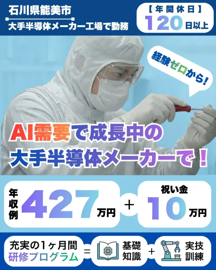 多い理由は2つです。①「安定して稼ぎたい」——夜勤手当など各種手当が充実していて、未経験でも収入を上げやすい環境です。②「将来性のある業界で働きたい」——半導体はAI・スマホ・電気自動車など幅広い製品に使われており、需要は伸び続けています。